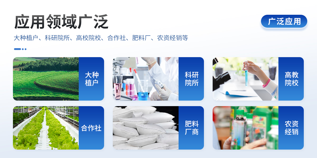 | 1、土壤養(yǎng)分:●土壤銨態(tài)氮、土壤有效磷、土壤速效鉀、土壤硝態(tài)氮、土壤水解氮、土壤全氮、土壤全磷、土壤全鉀、土壤有機(jī)質(zhì)(丘林法)、土壤有機(jī)質(zhì)(浸提法)、土壤總有機(jī)碳、土壤碳氮比、PH值、含鹽量、水分?!裢寥乐形⒘吭兀和寥棱}、土壤鎂、土壤硫、土壤硅、土壤硼、土壤鐵、土壤銅、土壤錳、土壤鋅、土壤氯、土壤鉬。 | 2、肥料養(yǎng)分:●單質(zhì)肥:氮肥中銨態(tài)氮、肥料硝態(tài)氮、尿素氮、縮二脲、磷肥中磷、磷肥中水溶性磷、鉀肥中鉀;●復(fù)合肥全氮、復(fù)合肥全磷、復(fù)合肥全鉀;●有機(jī)肥全氮、有機(jī)肥全磷、有機(jī)肥全鉀、有機(jī)肥硝態(tài)氮、有機(jī)肥速效磷、有機(jī)肥速效鉀、有機(jī)肥酸解氮、有機(jī)質(zhì);●水溶性腐植酸(風(fēng)化煤)、水溶性腐植酸(褐煤)、水溶性腐植酸(泥炭)、游離態(tài)腐植酸(風(fēng)化煤)、游離態(tài)腐植酸(褐煤)、游離態(tài)腐植酸(泥炭);●水溶肥全氮、水溶肥全磷、水溶肥全鉀;●葉面肥全氮、葉面肥全磷、葉面肥全鉀;●各種肥料微量元素:肥料鈣、肥料鎂、肥料硫、肥料硅、肥料硼、肥料鐵、肥料銅、肥料錳、肥料鋅、肥料氯、肥料鉬。 | 3、鮮作物營(yíng)養(yǎng):●作物硝態(tài)氮、作物銨態(tài)氮、作物磷、作物鉀;●作物中微量元素:作物鈣、作物鎂、作物硫、作物硅、作物硼、作物鐵、作物銅、作物錳、作物鋅、作物氯、作物鉬;●作物中硝酸鹽、亞硝酸鹽。 | 4、干植株?duì)I養(yǎng):●植株全氮、植株全磷、植株全鉀 | 5、煙葉營(yíng)養(yǎng):●全氮、全磷、全鉀、還原糖、水溶性總糖、硼、錳、鐵、銅、鈣、鎂等20項(xiàng)。 | 6、食品(水果、蔬菜等):●硝酸鹽、亞硝酸鹽、重金屬(鉛、鉻、鎘、砷、汞)等項(xiàng)。 | 7、水質(zhì)中:●銨態(tài)氮、水中磷、水中鉀、硝酸鹽、亞硝酸鹽、硬度、PH、鐵、銅、錳、鋅、硼、氯、硫、硅、鉬等 |