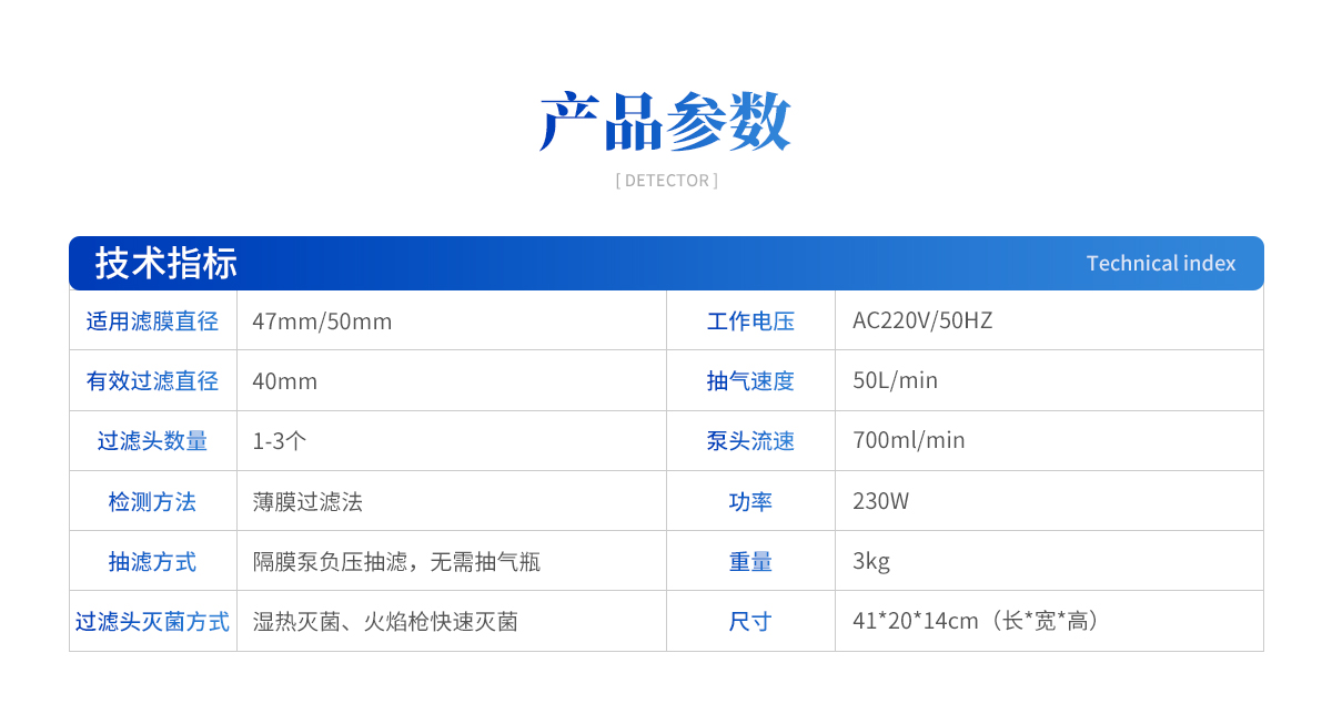 | 1、適用濾膜直徑:47mm/50mm 2、有效過濾直徑:40mm 3、過濾頭數(shù)量:1-3個(gè); 4、檢測(cè)方法:薄膜過濾法 5、抽濾方式:隔膜泵負(fù)壓抽濾,無需抽氣瓶 6、過濾頭滅菌方式:濕熱滅菌、火焰槍快速滅菌 7、尺寸:41*20*14cm(長*寬*高) 8、重量:3kg 9、功率:230W 10、工作電壓:AC220V/50HZ 11、噪音小于30dB 12、物理按鈕開關(guān) 13、可選擇單頭、三頭結(jié)構(gòu),選型豐富 14、抽氣速度:50L/min 15、泵頭流速:700ml/min |
