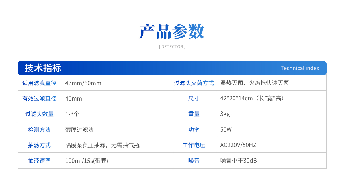 | 1、適用濾膜直徑:47mm/50mm 2、有效過濾直徑:40mm 3、過濾頭數(shù)量:1-3個 4、檢測方法:薄膜過濾法 5、抽濾方式:隔膜泵負壓抽濾,無需抽氣瓶 6、抽液速率:100ml/15s(帶膜) 7、過濾頭滅菌方式:濕熱滅菌、火焰槍快速滅菌 8、尺寸:42*20*14cm(長*寬*高) 9、重量:3kg 10、功率:50W 11、工作電壓:AC220V/50HZ 12、噪音小于30dB 13、物理按鈕開關 14、可選擇三頭、六頭結構,選型豐富 |