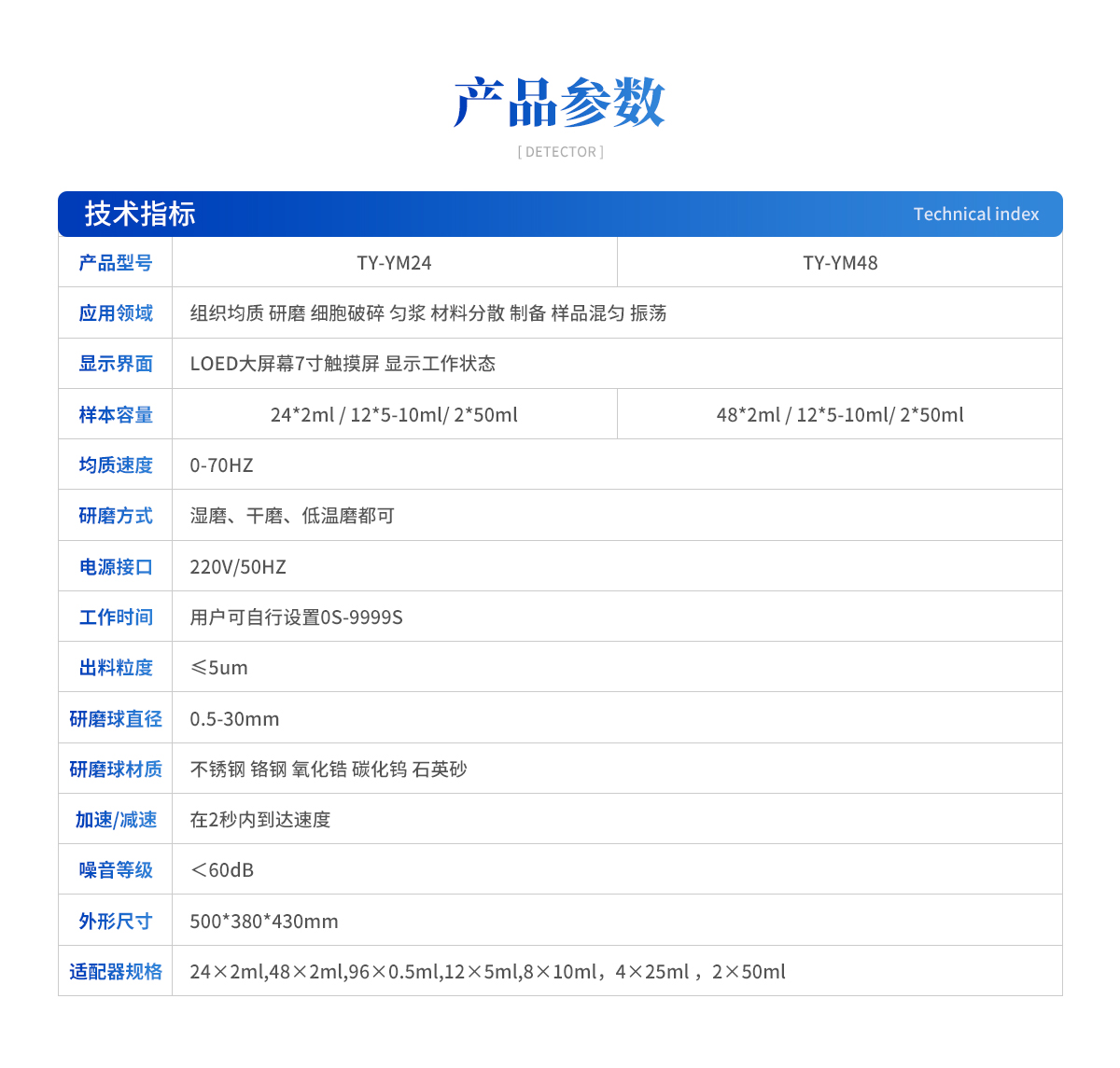 顯示界面:LOED大屏幕7寸觸摸屏 顯示工作狀態(tài) 樣本容量:24*2ml / 12*5-10ml/ 2*50ml 均質速度:0-70HZ 研磨方式:濕磨 干磨 低溫磨都可 電源接口:220V/50HZ 工作時間:用戶可自行設置0S-9999S 出料粒度:≤5um 研磨球直徑:0.5-30mm 研磨球材質:不銹鋼 鉻鋼 氧化鋯 碳化鎢 石英砂 加速減速:加速/減速 在2秒內(nèi)到達速度 噪音等級:<60dB 外形尺寸:500*380*430mm 適配器規(guī)格:24×2ml,48×2ml,96×0.5ml,12×5ml,8×10ml,4×25ml ,2×50ml |